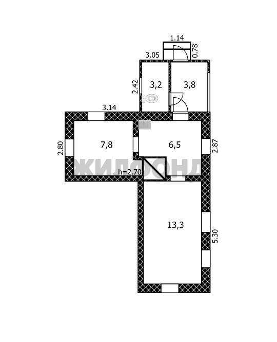 * две комнаты - 13,3 м2 и 7,8 м2, кухня - 6,5 м2, туалет.